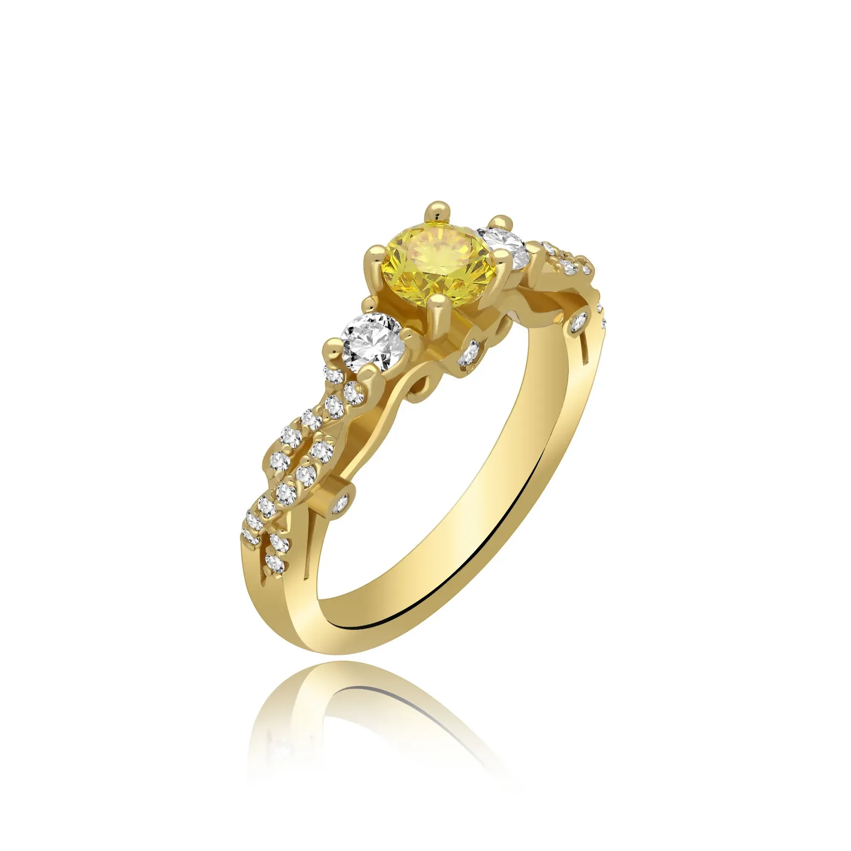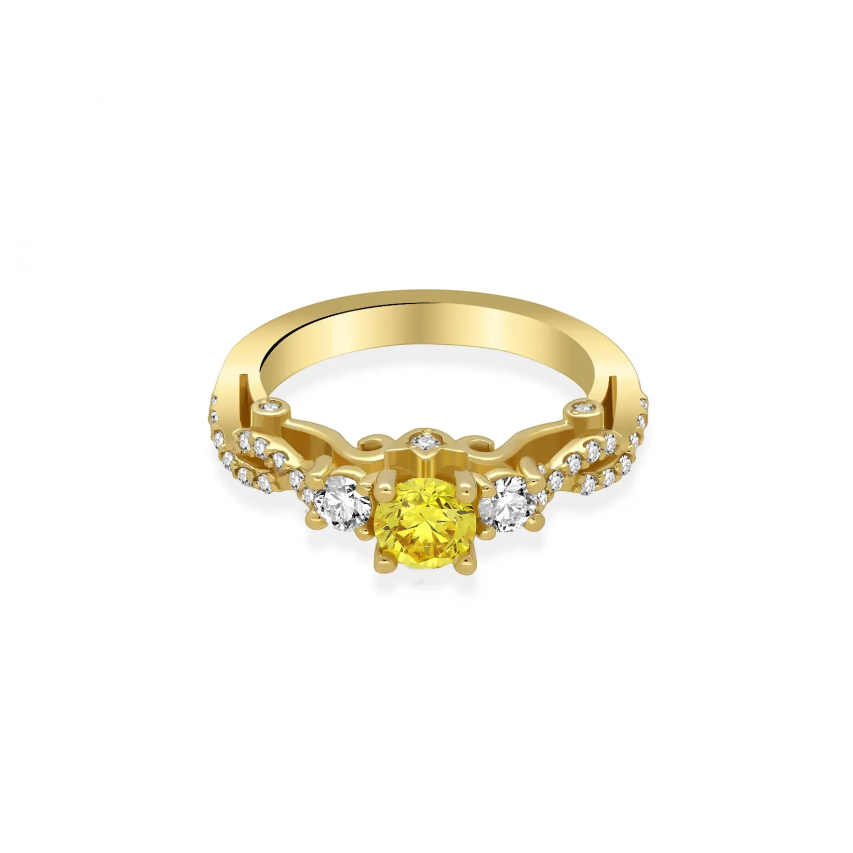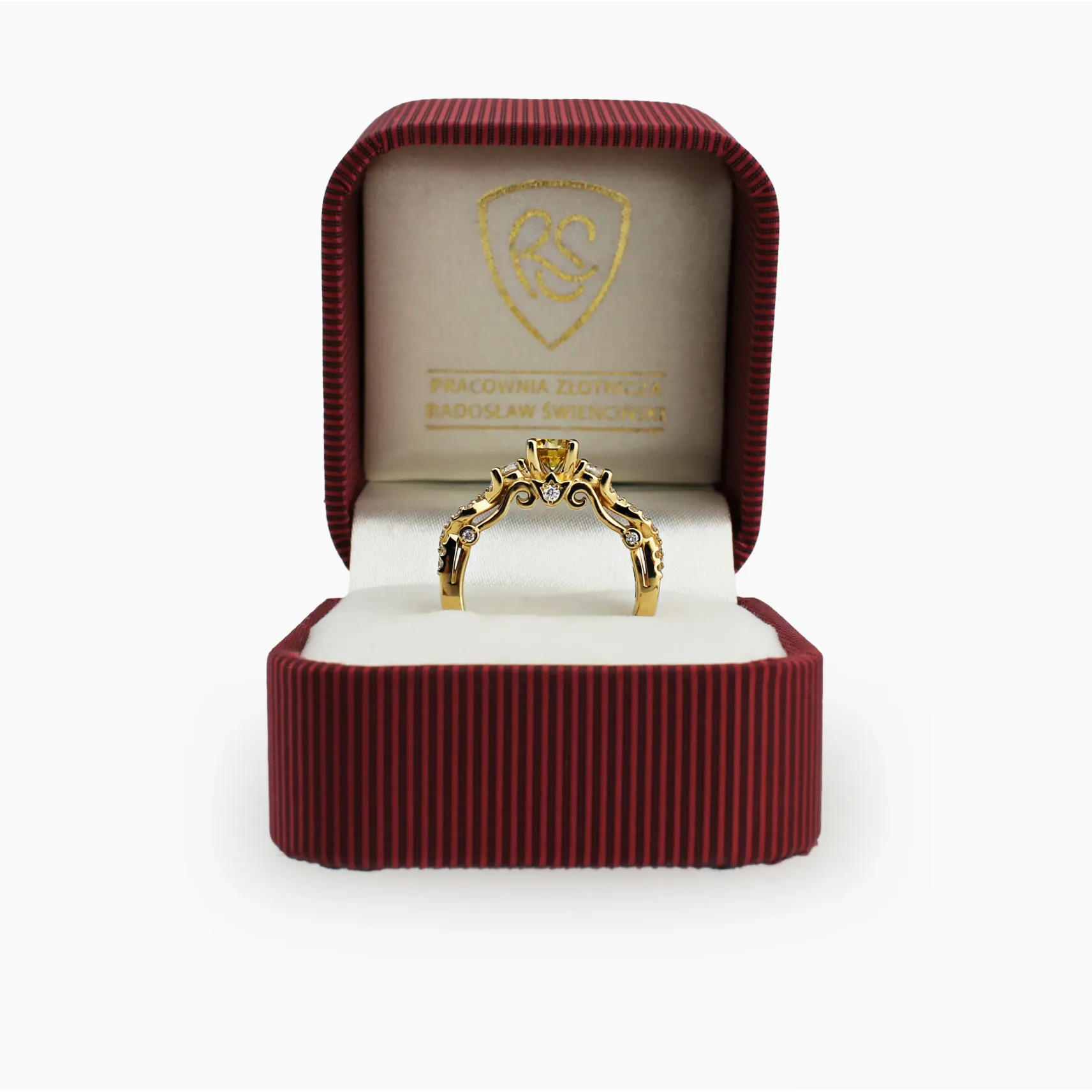 Starannie, ręcznie wykonany pierścionek z 14 karatowego  złota o próbie 585, przyozdobiony wyjątkowym brylantem centralnym fancy yellow (0,50ct) oraz wieloma brylantami bocznymi (0,39ct) o barwie G-H oraz czystości SI. Dostępny w trzech kolorach złota: białym, żółtym i różowym. Do zakupu dołączany jest certyfikat potwierdzający autentyczność brylantów. Wszystkie nasze produkty wykonane są z najwyższej jakości materiałów i kamieni szlachetnych. Biżuteria objęta jest 12 miesięczną gwarancją pracowni. Pierścionek wykonany w autorskiej Pracowni Złotniczej Radosława Świeńcińskiego. Nasza biżuteria to wyjątkowy prezent na każdą okazję.